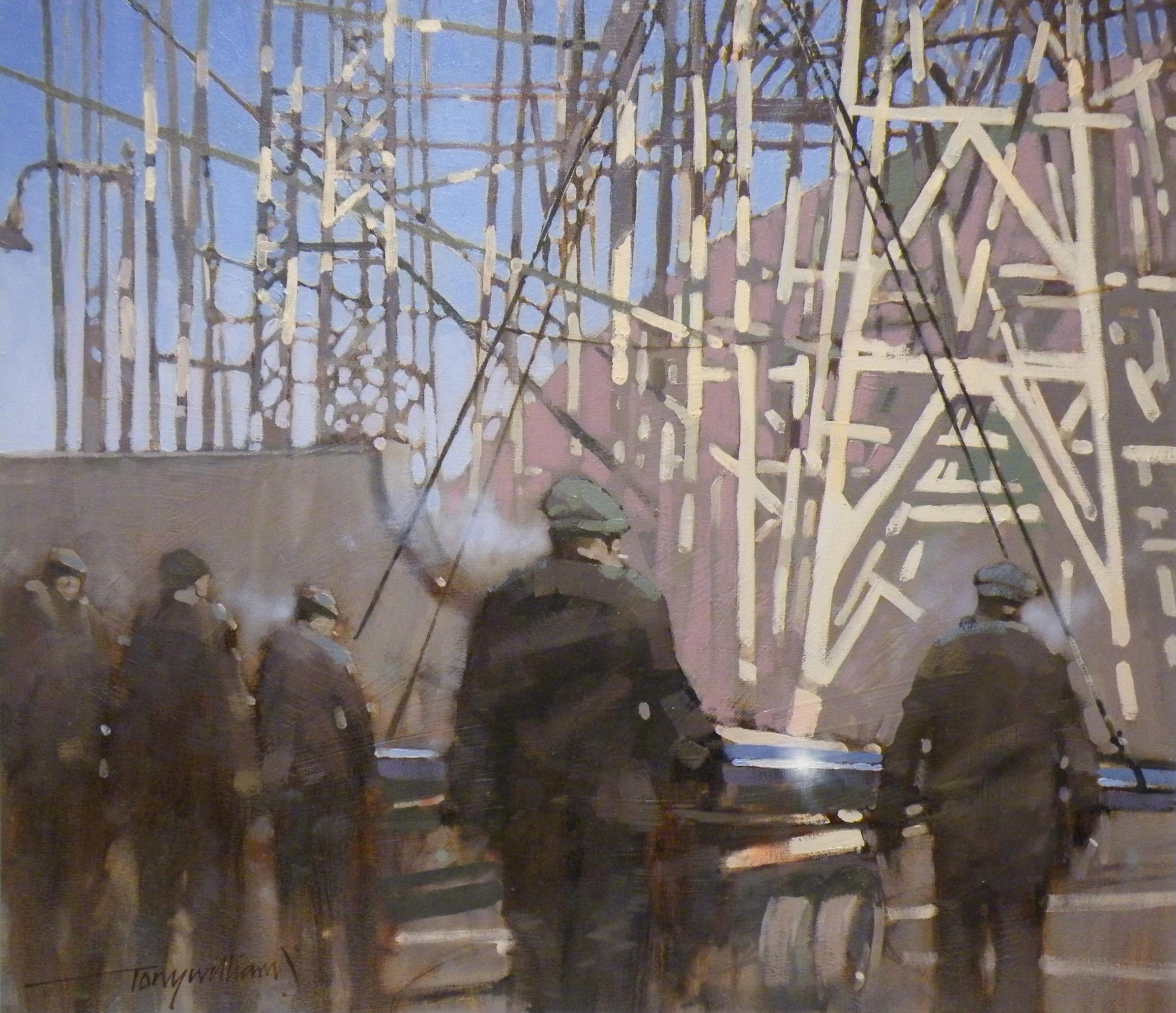 Tony’s marine paintings have been exhibited at the Mall Galleries exhibitions each year since 2015 and are held in many private collections worldwide. This current collection of work has evolved to depict a series of paintings celebrating the working lives of men in the British ship building yards, deep sea fishing and the British coal miners, evoking the atmosphere of industry during the pre and post war years, but still includes Tony’s love of painting water, boats and livestock subjects.